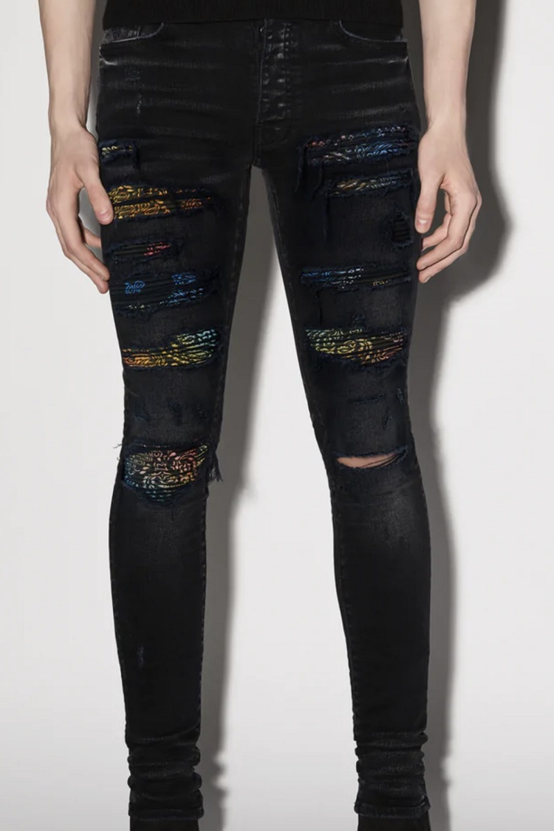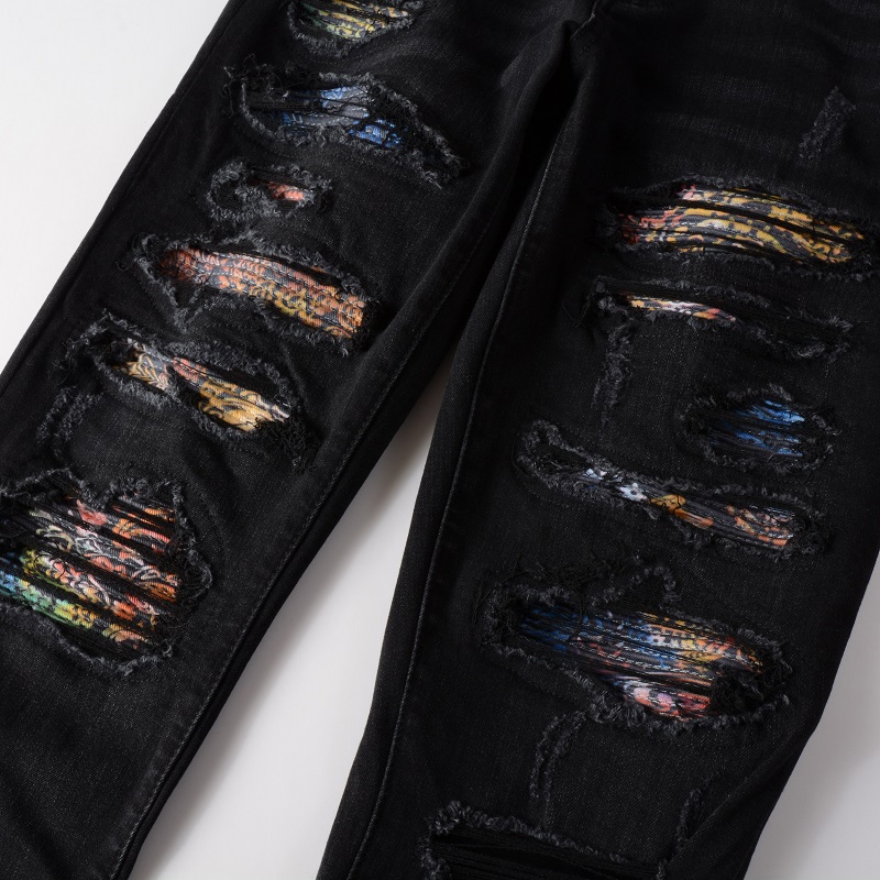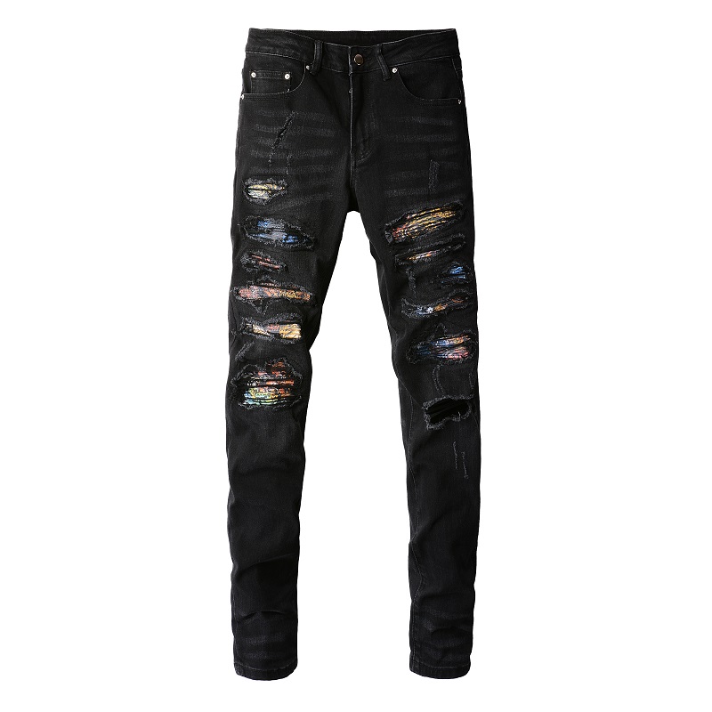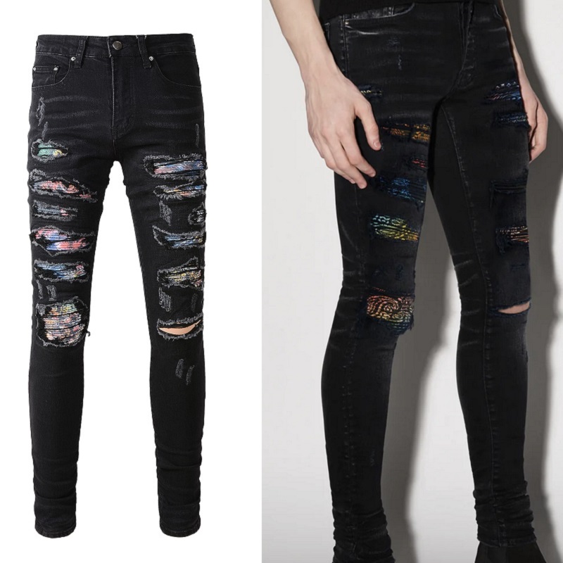 Men’s Fashion Simple Print Patch Tattered Stretch Jeans